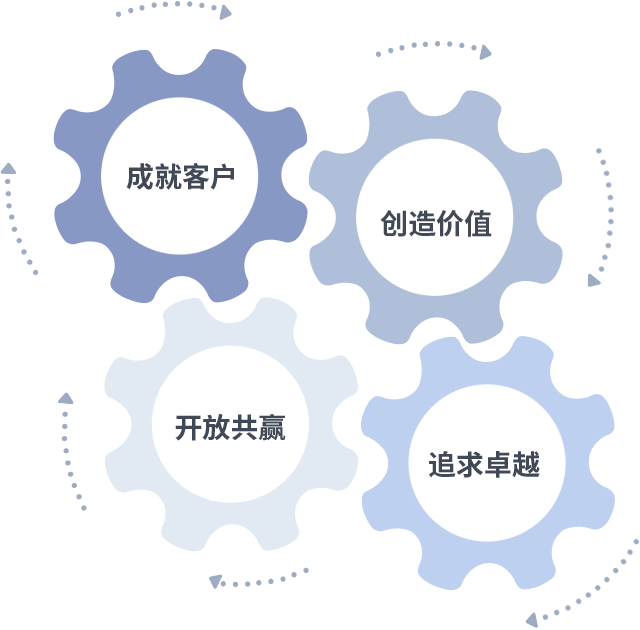 成就客户是一切决策的出发点,创造价值是衡量所有工作的标准,追求卓越是广东会vip贵宾厅做事做人的态度,开放共赢是广东会vip贵宾厅的格局也是最终的结果。价值观的齿轮环环相扣,推动着组织里的每个人不断向前。
